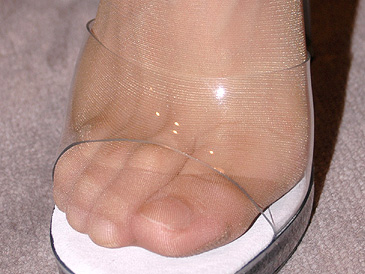 透明クリアのハイヒールは、普段は見ることができないハイヒールの中でのパンスト足の状態もしっかりと観察でき、定番パンストの一番フェチな部分であるパンストつま先三日月も完全に露出するので、街で見かけるハイヒールを履いた女の子のパンスト足を忠実に透視したのと同じ環境といえます。 |